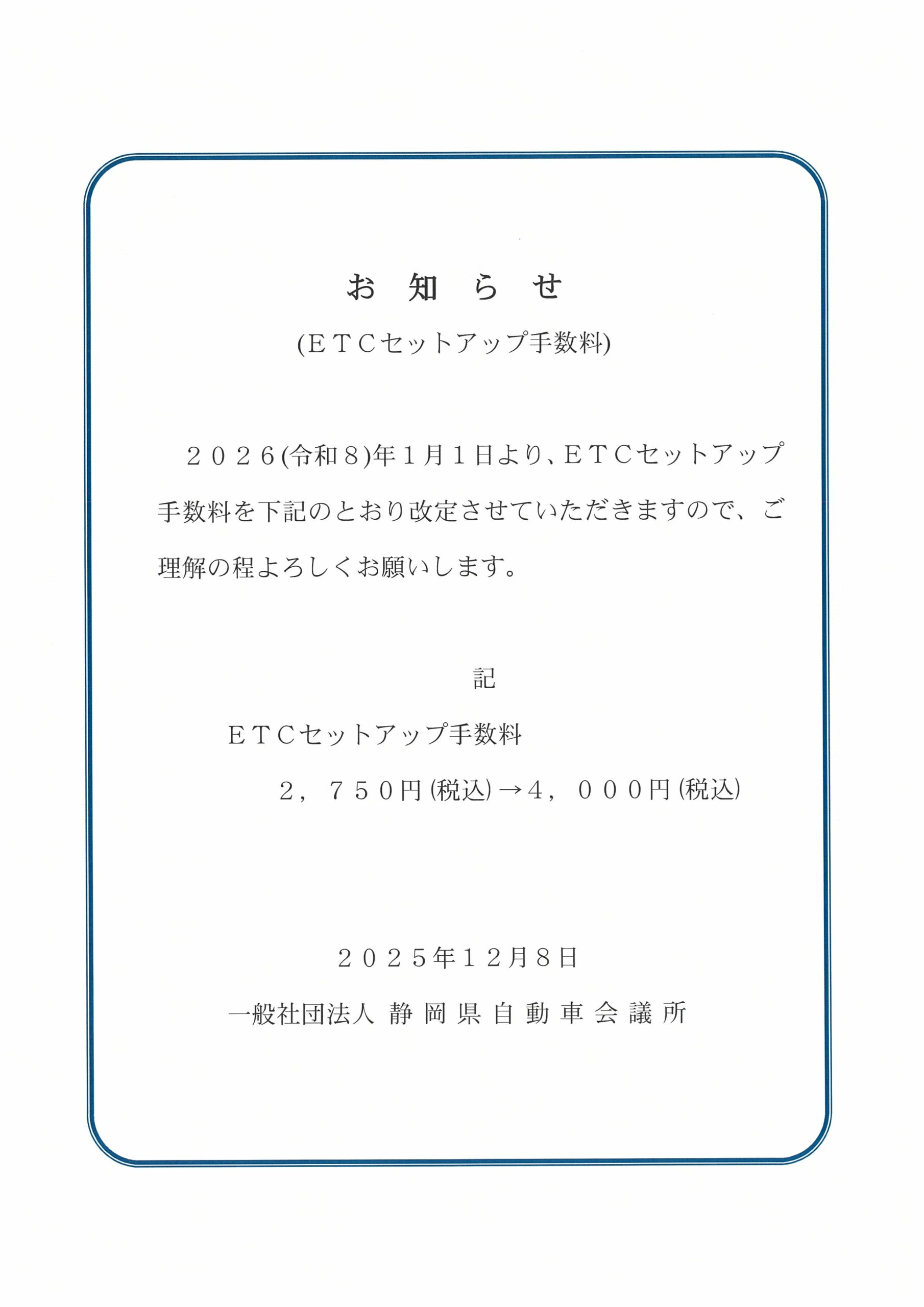 令和8年1月1日より、ETCセットアップ手数料価格が変更になります。