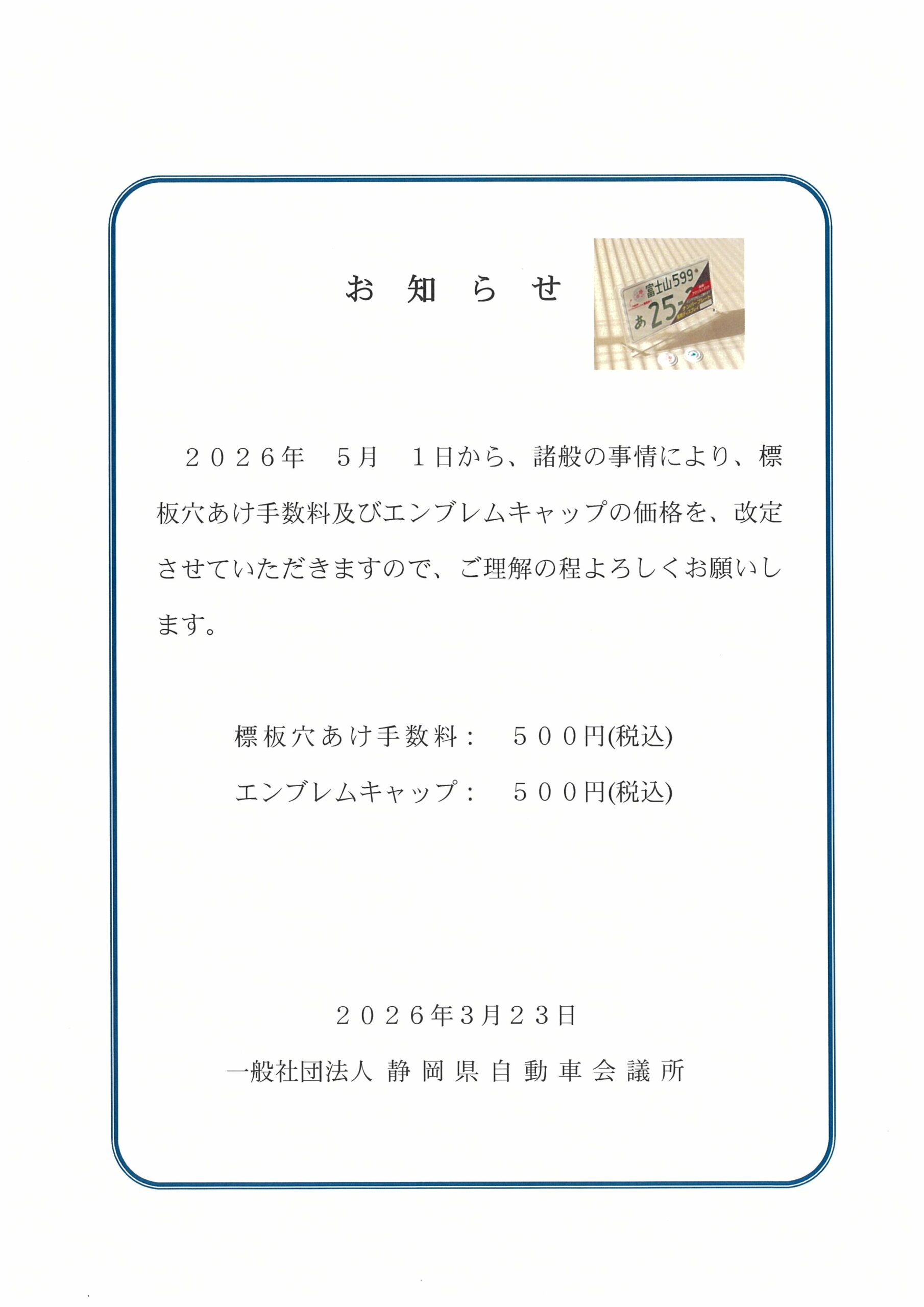 令和8年5月1日より、標板穴あけ手数料及びエンブレムキャップの価格が変更になります。